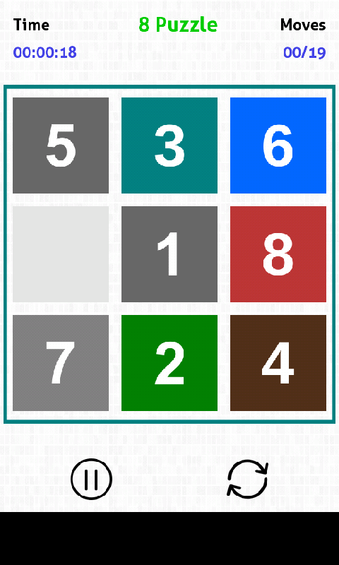 8 پازل است که در یک شبکه 3 در 3 با 8 بلوک های مربع برچسب 1 تا 8 و یک مربع خالی ایفا کرده است. هدف شما این است به تنظیم مجدد بلوک به طوری که آنها به ترتیب، با استفاده از حرکت چند که ممکن است. شما تنها مجاز به اسلاید یک بلوک افقی یا عمودی را به مربع های خالی.