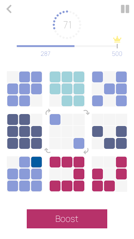 مربع های رنگارنگ در هیئت مدیره مرکزی در ترکیب های مختلف ظاهر می شود. پیدا کنید که در آن در هر یک از تخته های جانبی مناسب است. در صورت لزوم، صفحه اصلی مرکزی را تغییر دهید. برای انتقال مربع ها، یکی از تخته های جانبی را ضربه بزنید. سعی کنید هر هیئت مدیره را با مربع های همان رنگ برای نقاط اضافی پر کنید.