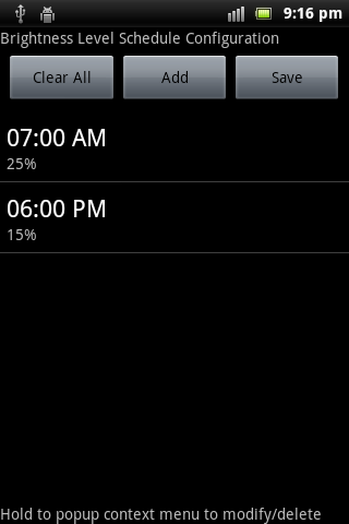 Special note: The LCD brightness won't be immediately applied to bother you when the schedule goes off and you are using the phone or other applications are in the foreground. The brightness level change is applied during any LCD power mode change, such as LCD dims, locked, or unlocked, or wake up.