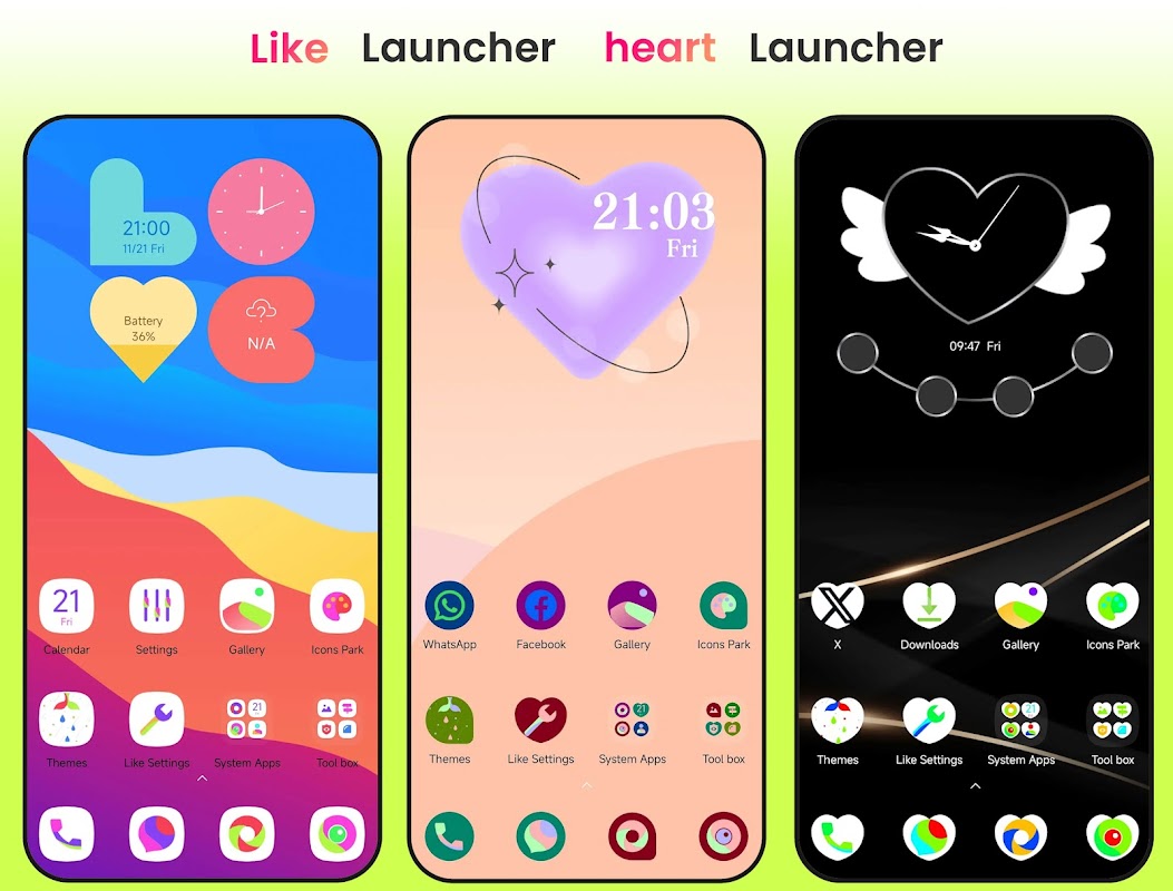 + Like Launcher می تواند همه نمادها را به شکل نمادهای مختلف مانند شکل Galaxy S25، شکل ios، شکل گرد و غیره، خنک کند.