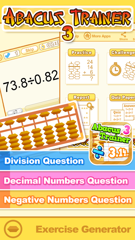 چرتکه ترینر 3 یک ژنراتور درخواست تمرکز بر مهارت هایی که در تقسیم و اعداد منفی است. این فراهم می کند طیف وسیعی از گزینه هایی که می توان انعطاف پذیری انتخاب متناسب با نیاز حفاری. کاربران می توانند برای تمرین در هر جنبه ای از تقسیم چرتکه، اعشار و تکنیک های گرد به دست در کتاب 2، و همچنین اعداد منفی به دست در کتاب 3. ورودی پاسخ انعطاف پذیر را می توان یا با استفاده از چرتکه و یا کلیدهای عددی وارد شده است.