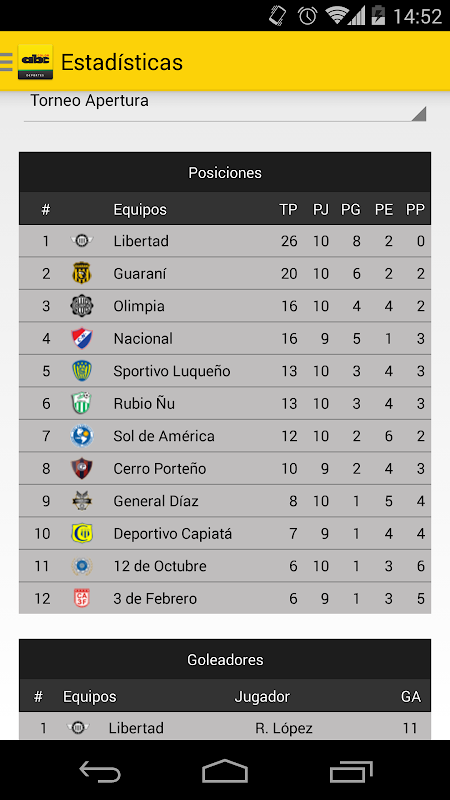 En su Android tendrá las fechas del torneo paraguayo que quedan por jugarse y las estadísticas (tabla de posiciones y goleadores) del fútbol local.
