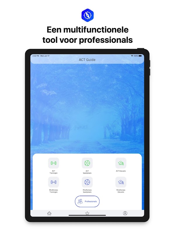 برنامه راهنمای ACT ابزاری چند منظوره برای متخصصانی است که براساس تکنیکهای روانشناسی مثبت کار می کنند. با استفاده از این برنامه تعداد زیادی تمرین ، انیمیشن ، بازی ، فیلم و تصاویر به دست می آورید. شما می توانید تمرینات و حتی جلسات کل را برای کلیه مشتری های خود ارسال کنید ، که تا زمانی که با شما برنامه ای را دنبال کنند ، همه می توانند از این برنامه به صورت رایگان استفاده کنند.