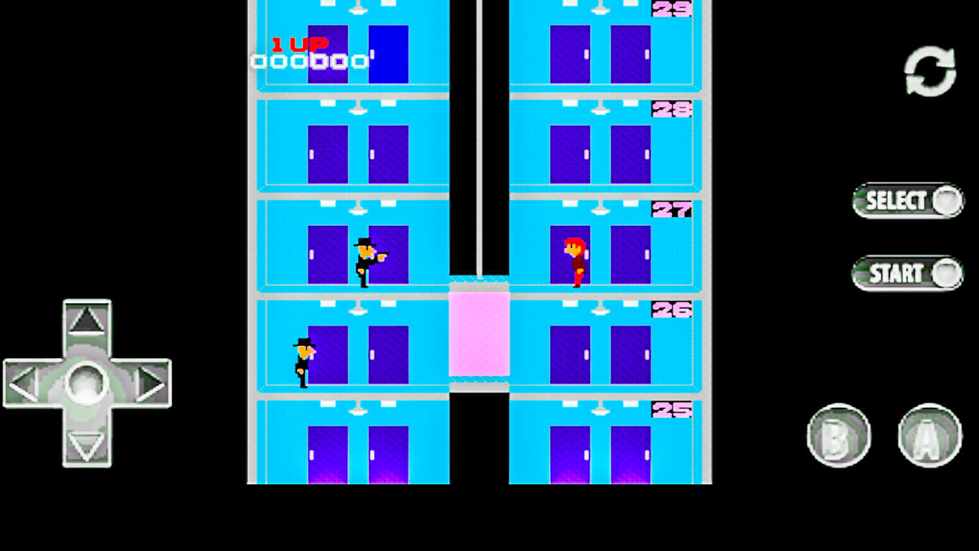 Otto can move left and right, jump(A button), duck, and fire(B button) up to three shots at a time from his pistol. While Otto is in an elevator, the player can push up or down to send him to a higher or lower floor; however, Otto cannot duck as long as he is inside. He can run or jump across an empty shaft as long as the elevator is above him, and can ride on its roof but not control its motion or cross to the other side. The player can push up or down to make Otto ride an escalator.