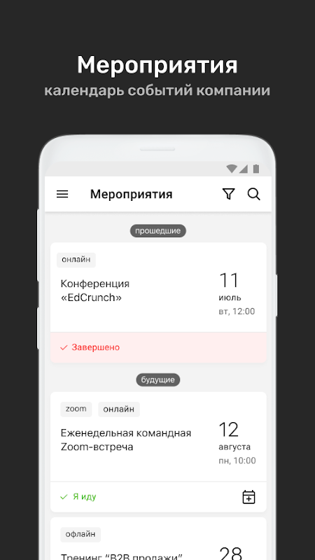 ⁃ Календарь корпоративных мероприятий с возможностью подать заявку на участие