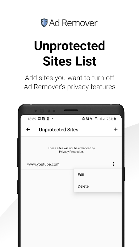 فهرست سایتهای محافظتنشده – وبسایتها را به فهرست سایتهای محافظتنشده اضافه کنید تا ویژگیهای حریم خصوصی و مسدود کردن آگهی حذف کننده آگهی خاموش شود.