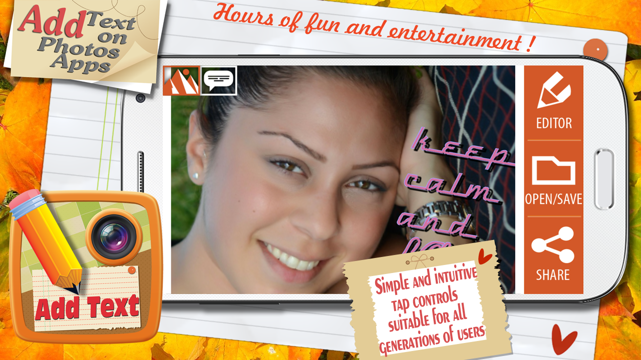 ➤ Add Text on Photos App ➤ will be an excellent choice for all lovers of photography, pic collages and photo frames. If you are a fan of watermarking and adding text to pictures, hurry up and be the first to download this “text on photo editor”. This excellent app will not disappoint you because it offers you a high-quality design and intuitive tap controls. It is suitable for kids, teenagers, and the adults, for females and for males. It will provide you with hours of fun and it will also give you a chance to think about some nice poem or a message that you can add to your photo.