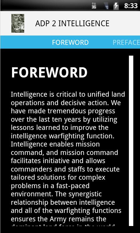 دکترین انتشارات ارتش (ADP) 2-0 اطلاعات، فراهم می کند سازه مشترک برای پشتیبانی از اطلاعات در محیط های پیچیده عملیاتی و چارچوب برای حمایت از عملیات سرزمین واحد و یکپارچه در سراسر طیف وسیعی از عملیات نظامی است. این نشریه به عنوان پایه و اساس اعتقادی اطلاعاتی ارتش ما است. هر سرباز و کسانی که غیر نظامیان ارتش که ارتباط برقرار کردن با تابع warfighting هوش، فقط حرفه ای اطلاعاتی، باید به اصول اعتقادی هوش ارتش را درک کنید.
