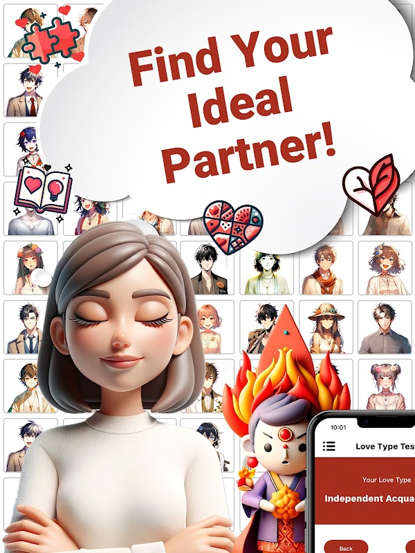 - **شناسایی سبک عشق**: با استفاده از 60 سوال بر اساس روانشناسی، برنامه سبک عشق شما را تعیین می کند و مفهوم سرنوشت عاشقانه را در بر می گیرد.