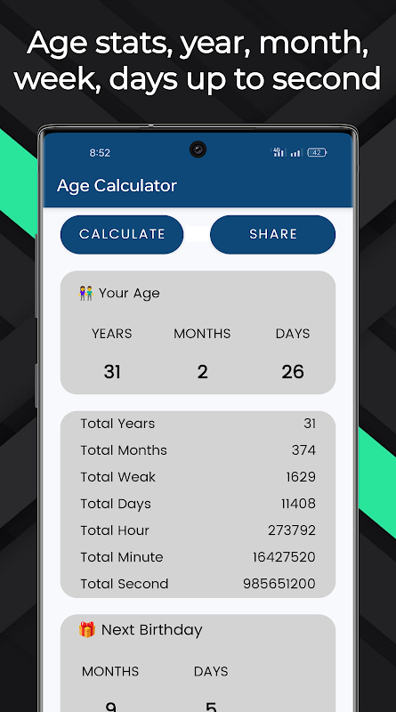 سن دقیق را با تاریخ تولد ساده بیابید، برنامه سن شما را بر حسب سال، هفته، روز، دقیقه و حتی بر حسب ثانیه محاسبه می کند. سن خود را با دوستان و اعضای خانواده خود به اشتراک بگذارید، تولدهای آینده را دریافت کنید، تفاوت بین دو تاریخ کاهش به دقیقه و ثانیه را محاسبه کنید و دو سن را با هم مقایسه کنید.