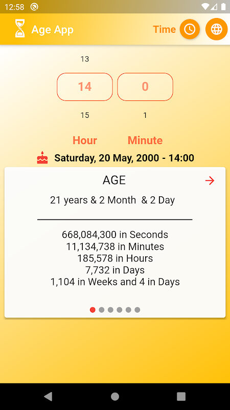 این برنامه یک رابط کاربری ساده و زیبا برای استفاده آسان ارائه می دهد. فقط تاریخ تولد و / یا زمان تولد خود را انتخاب کنید ، سپس برنامه Age به طور مستقیم محاسبه می شود