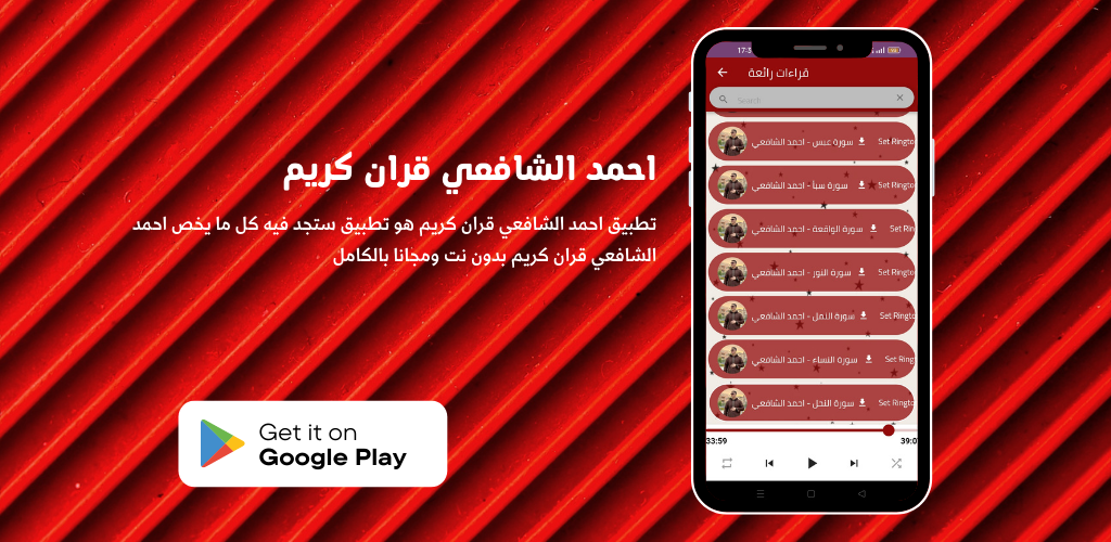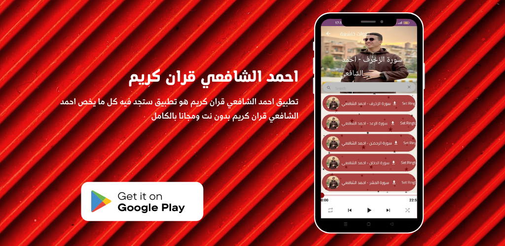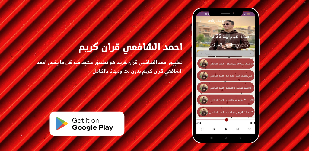 An application for Ahmed Al-Shafei provides you with: Reciter_Quran Karim and Nasheeds soon. Reader with the voice of Ahmed hear and download the Noble Qur’an with the voice of the reader Ahmed Al-Shafei. It included many recitations and the entire Surah of the Cave, the Holy Qur’an, with the voice of the reciter Ahmed Al-Shafi’i, reciting the Qur’an, in addition to the legal ruqyah and its beautiful duration of the Qur’an.