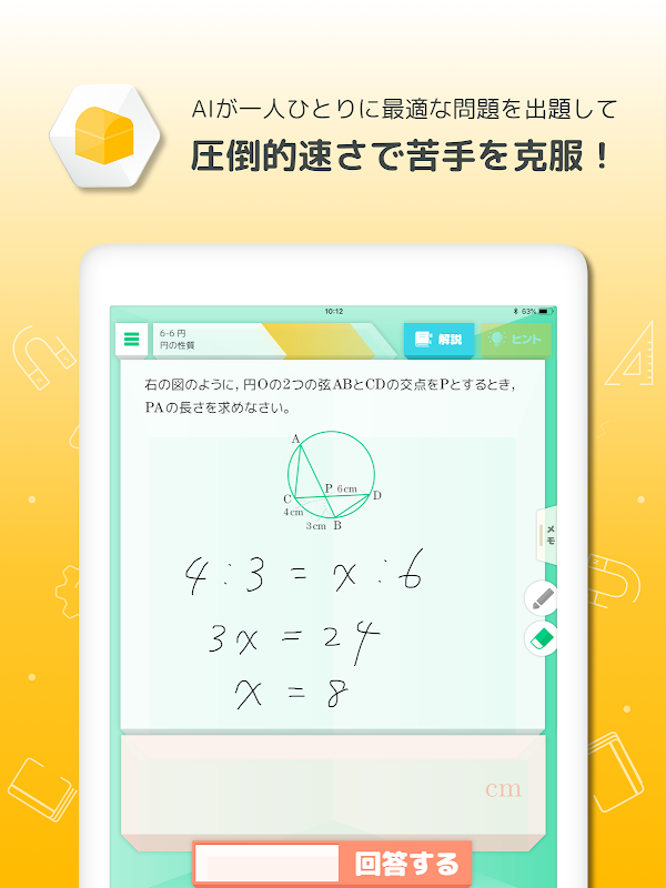 هوش مصنوعی نقاط ضعف را از پاسخهای دانش آموزان تجزیه و تحلیل می کند و به طور خودکار یک سوال بازبینی در این زمینه می دهد. با حل آن، نقاط ضعف یک به یک غلبه می کنند و ریاضیات بیشتر و بیشتر درک می شود. همچنین، همانطور که از آن استفاده می کنید، هوش مصنوعی همچنان ویژگی های دانش آموزان خود را یاد می گیرد و به عنوان تنها "شریک یادگیری" در جهان تکامل می یابد.