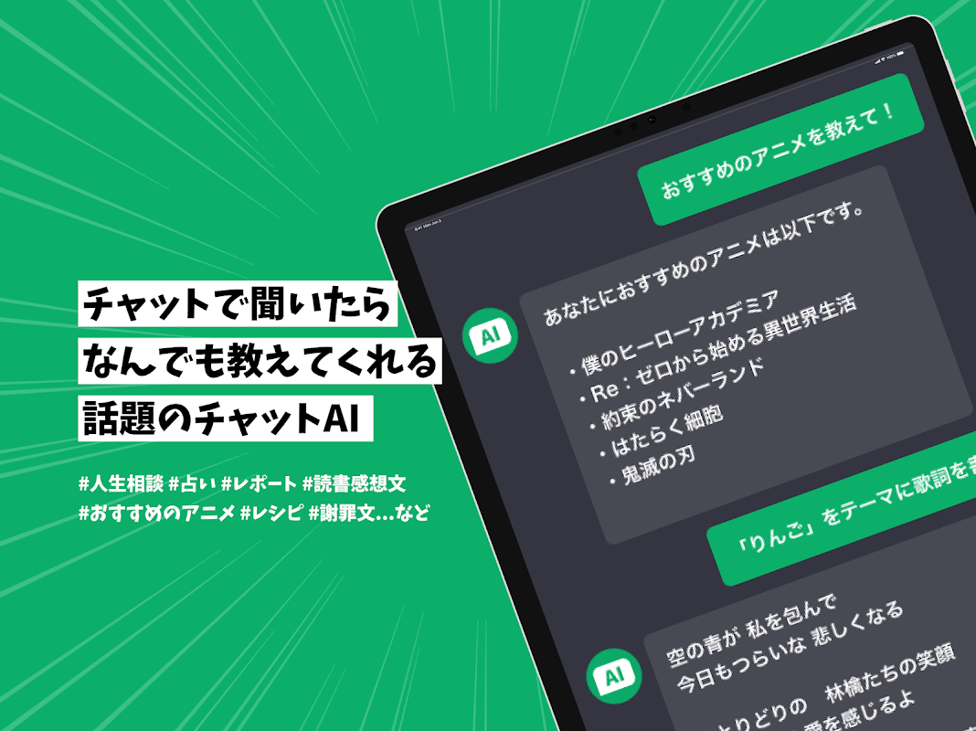 تعداد زیادی حضور در تلویزیون! یک برنامه چت هوش مصنوعی که با بیش از 3 میلیون ثبت نام به زبان ژاپنی قابل استفاده است. از مشاوره در مورد نگرانی ها و عشق تا بهبود بازده کاری. از گپ GPT OpenAI استفاده می کند.
