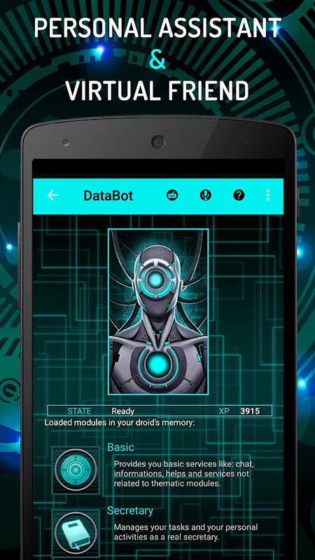 دستیار صوتی DataBot دوستانه ترین برنامه هوش مصنوعی برای اندروید است! هر چیزی را که می خواهید از ربات هوش مصنوعی از دوست خود بپرسید، مانند جارویس، دستیار با صدای خود به درخواست های شما در مورد موضوع مورد علاقه شما پاسخ می دهد. برنامه ها و خدمات ادغام شده در هوش مصنوعی دستیار شما تصاویر، جستجوی صوتی و ارائه های چند رسانه ای را به شما ارائه می دهند. .