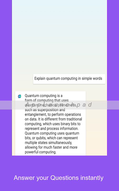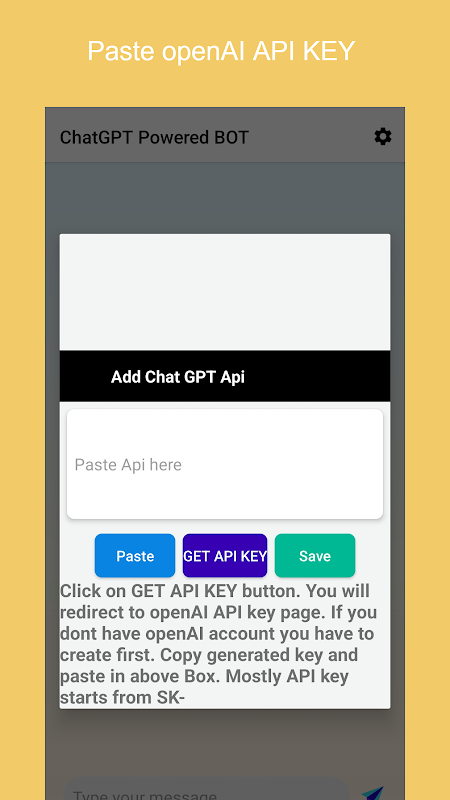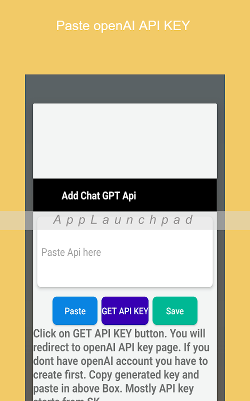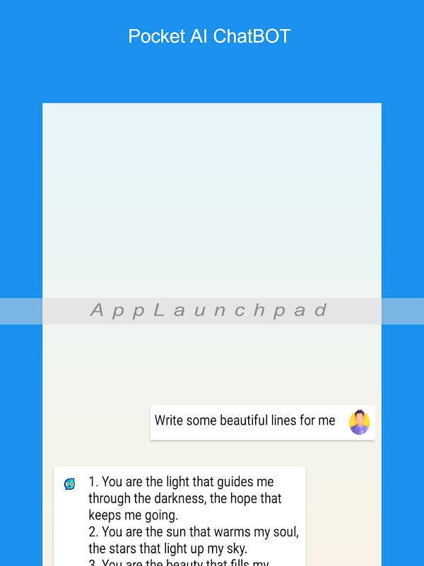 ما یک برنامه چت بات ساده ساختیم که از کلید openAI API برای تعامل با Chat GPT استفاده می کند. ایده اصلی ایجاد یک اپلیکیشن موبایل که به افراد امکان می دهد فوراً از چت ربات هوش مصنوعی استفاده کنند، دسترسی راحت و کارآمد به فناوری هوش مصنوعی است. با دسترسی آسان ربات چت از طریق یک برنامه تلفن همراه، کاربران می توانند به سرعت پاسخ سؤالات خود را دریافت کنند، توصیه های مفیدی دریافت کنند یا با ربات چت وارد مکالمه های معمولی شوند. هدف این رویکرد استفاده از قدرت هوش مصنوعی برای ارائه یک تجربه بدون درز و کاربرپسند برای کسانی است که می خواهند از این فناوری در حال حرکت استفاده کنند. شما می توانید مقالات کاملا سئوی بهینه شده بنویسید، جزئیات هر موضوعی را تنها با یک کلیک بنویسید. فقط یک بار راه اندازی مورد نیاز است.