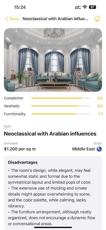 • تفکیک سبک: نام سبک، کشور مبدأ، امتیاز کامل، امتیاز زیبایی شناسی، امتیاز عملکرد، هزینه در هر متر مربع، به علاوه توصیههای بهبود مناسب.
