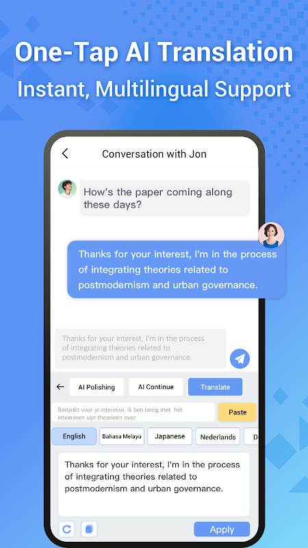 هر چیزی را در هر برنامه ای فوراً ترجمه کنید. صفحه کلید هوش مصنوعی - Writing & Chatbot ترجمه بدون درز با یک ضربه را ارائه می دهد. پشتیبانی از زبان ها برای ارتباط سریع و جهانی.
