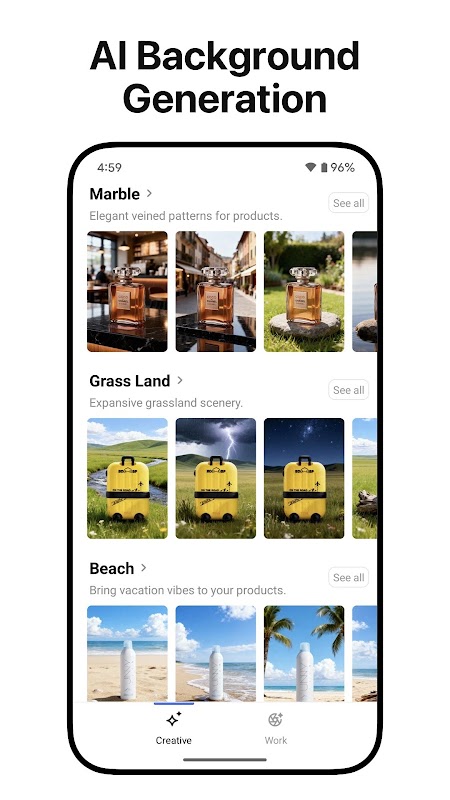 - ویرایش عکس با هوش مصنوعی: پسزمینههای ناخواسته را بهطور خودکار حذف کنید، آنها را با صحنههای سفارشی جایگزین کنید، سایهها را اضافه کنید یا اشیاء حواسپرتی را پاک کنید تا محصول شما واضح و حرفهای به نظر برسد.