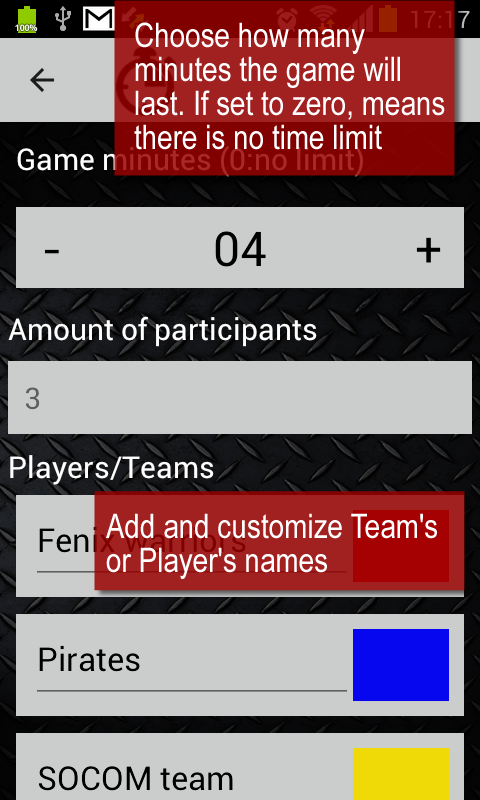 شما می توانید نام از بازیکنان و تیم های برای بازی را مشخص کنید.