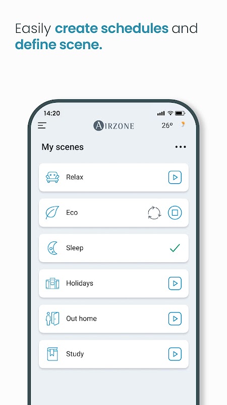 برنامه Airzone Cloud از مبل یا تخت، در دفتر کار یا هنگام قدم زدن در پارک، به شما امکان می دهد AC را با استفاده از دستگاه های هوشمند خود کنترل کنید. هوا را روشن یا خاموش کنید و دمای هر اتاق را جداگانه تنظیم کنید تا حداکثر راحتی را با صرفه جویی عالی انجام دهید.