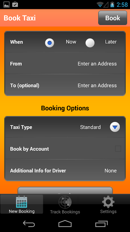 • Request a taxi cab right now, or select a future date and time for pick-up.