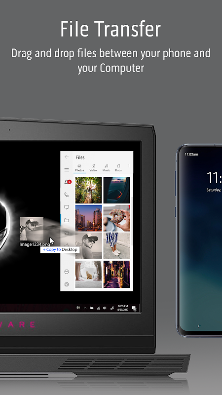 Alienware Mobile Connect minimizes distractions by allowing you to make calls, send texts, get notifications, transfer files and control your phone conveniently from your Alienware computer. Put your phone away and use it through your computer’s screen, touch, mouse or keyboard!