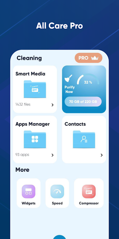 با AllCarePro، میتوانید رسانههای خود را مدیریت کنید، درصد باتری خود را کنترل کنید، مخاطبین خود را مدیریت کنید، سرعت اینترنت را آزمایش کنید، ویدیوها را فشرده کنید و برنامههای خود را ایمن کنید، همه از یک برنامه.