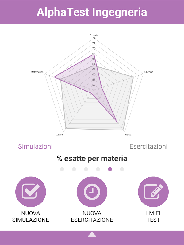 - simulazioni complete del test di ammissione al TOLC-I di Ingegneria del CISIA, con statistiche immediate sul punteggio che hai totalizzato per ogni materia e numero di domande esatte, omesse ed errate