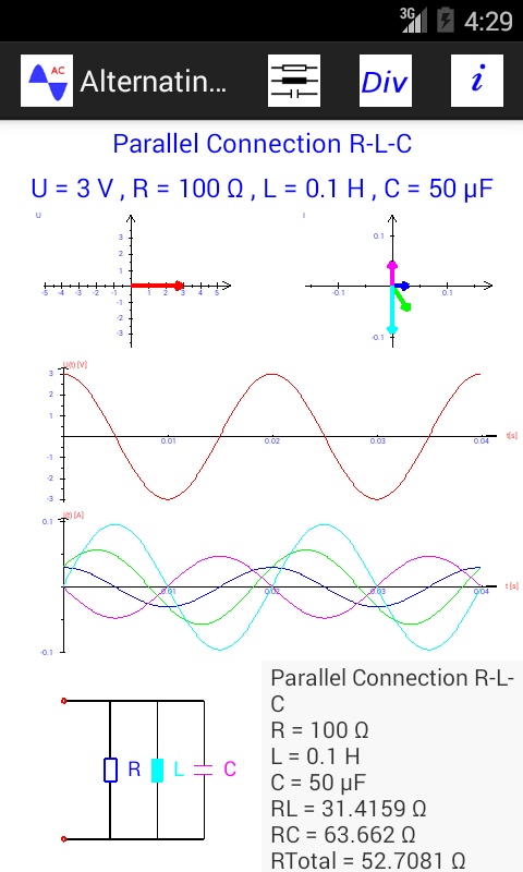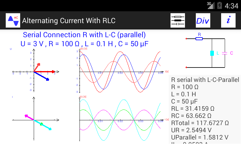 برنامه "متناوب Currnet با RLC" طراحی شده است به تجسم روابط متقابل جریان های الکتریکی و ولتاژ در مدارهای با استفاده از مقاومت ها، خازن و سلف. ولتاژ کل فرض شده است فرم کسینوس باشد. تمرکز اصلی در نمایش گرافیکی و محاسبه است. دیدگاه ها زیر بخشی از این برنامه:
