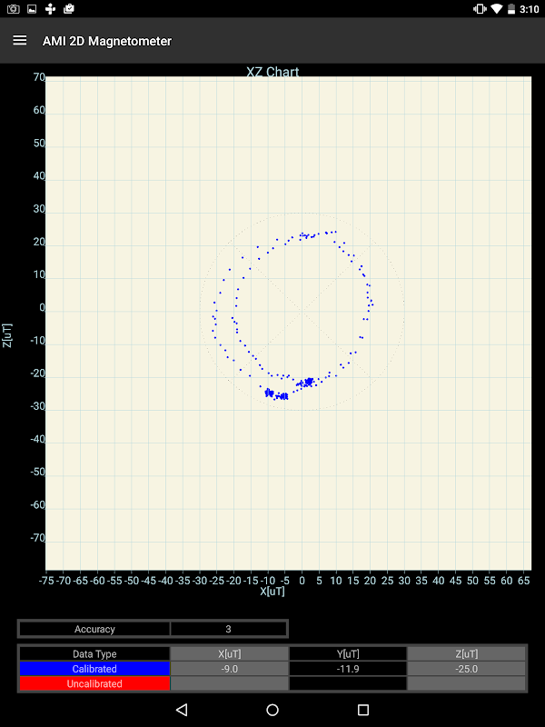 This is a simple plotting application for evaluating the built-in magnetometer in your device. By rotating your smart phone or tablet 360 degrees, the plotted data creates a circle. If the sensor calibration is good, the origin of the circle will be near 0[uT]. The application can plot the non-calibrated raw data. It helps you to understand how the calibration works.