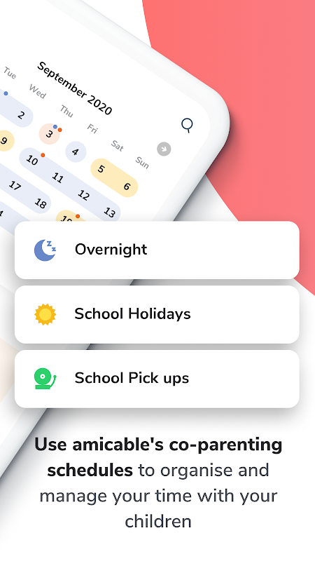 تقویم خانوادگی والدین مشترک amicable به والدین جدا شده یا مطلقه کمک می کند تا رویدادهای فردی و مشترک از جمله ترک تحصیل و تحویل گرفتن از مدرسه، قرارهای دندانپزشکی و پزشکی و فعالیت های تعطیلات مدرسه را پیگیری کنند. از برنامههای مراقبت مشترک برای راهنمایی و نمونههایی از روشهای معمولی برای به اشتراک گذاشتن مراقبت از فرزندان خود استفاده کنید و اطمینان حاصل کنید که آنها با هر دوی شما وقت میگذرانند.