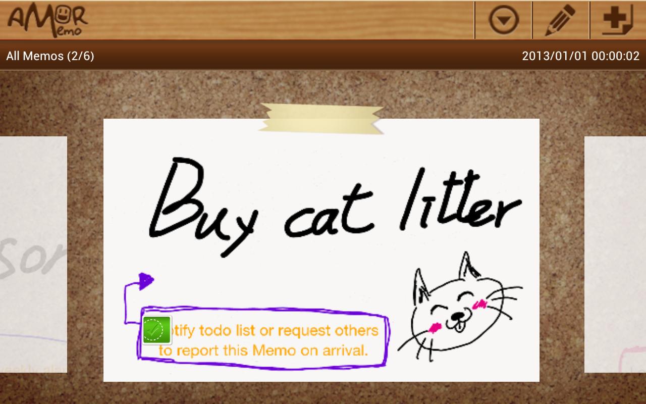 AMOR Memo is an easy-to-use, entertaining app that allows you share and forward interesting things to your friends and Facebook. A memo can include handwriting, inserting movies, sounds, pictures, text messages and map. Inviting your friends to start using this entertaining AMOR Memo, you can both use SMS or Email.