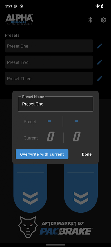 این برنامه آسان برای استفاده، بازخورد فشار زمان واقعی را در هر فنر هوا می خواند. علاوه بر این، دارای سه دکمه است که به شما امکان می دهد تنظیمات از پیش تعیین شده را ذخیره کنید تا بتوانید به سرعت به فشار فنر هوای مورد نظر خود برسید. برنامه کنترلهای بیسیم AMP با کنترلهای فنر هوای بیسیم AMP Pacbrake (کیت شماره HP10316) کار میکند.