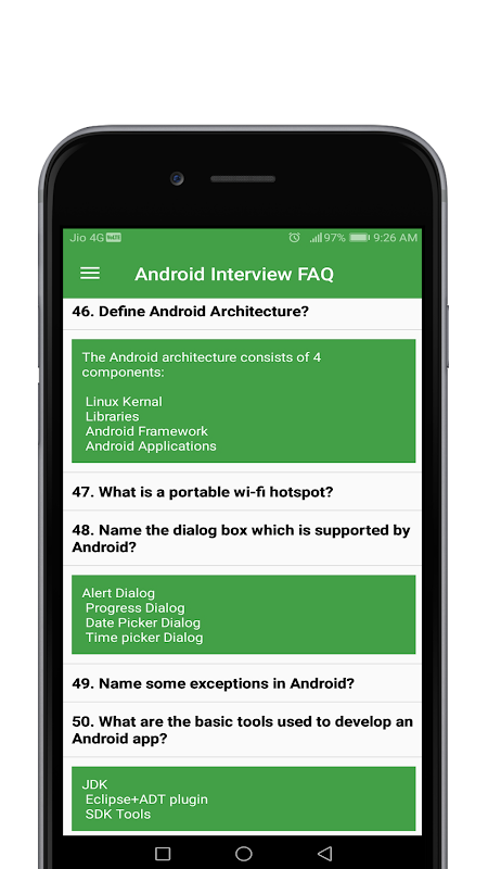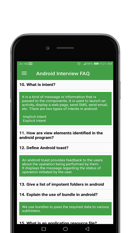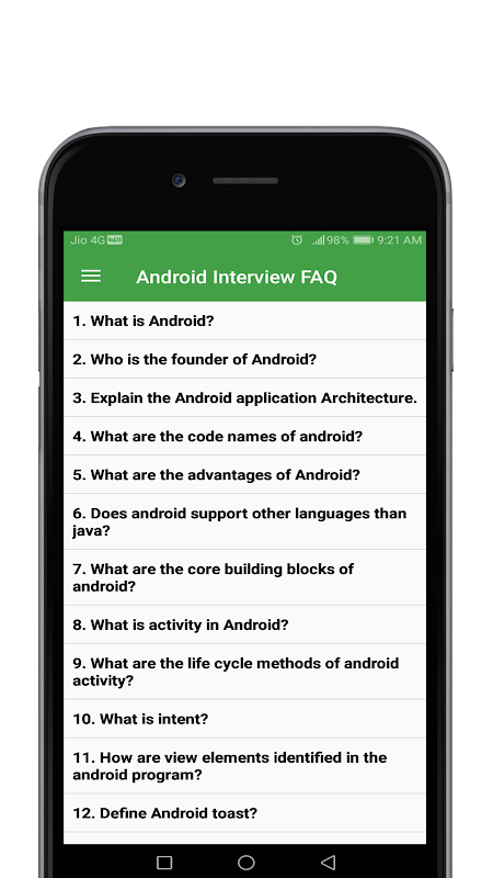 این برنامه شامل 50 سQال متداول پرسش و پاسخ اندروید با پاسخ است. همه این س questionsالات را اغلب مصاحبه کنندگان می پرسند. اگر شما یک برنامه نویس Android هستید ، باید برای افزایش دانش خود این برنامه را امتحان کنید. اگر برای مشخصات شغلی توسعه دهنده برنامه تلفن همراه متقاضی هستید ، باید همه این س FAالات متداول را برای مصاحبه آماده کنید.
