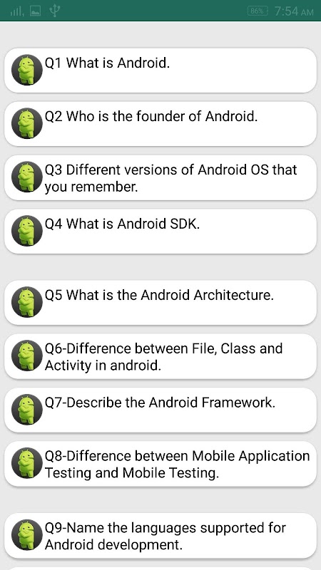 این برنامه شامل پرسش های مصاحبه Android است که اکثر پرسش های مهم را مطرح می کنند.