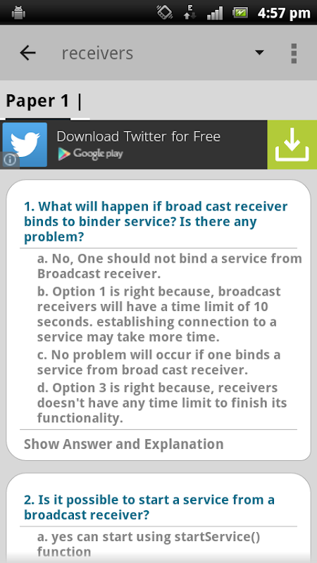 This app is for aspiring people who would like to improve their programming skills by solving android questions, and have fun in the process of learning android programming.