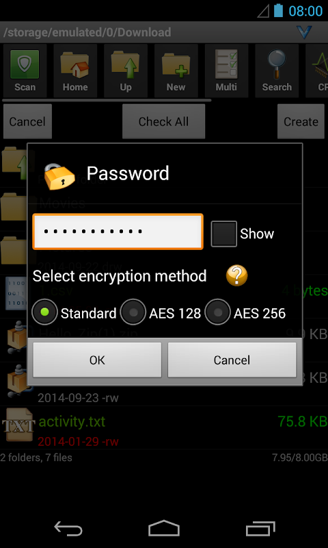 Full support for decompression of encrypted ZIP files (Standard, AES-128 and AES 256 bit), compatible with WinRaR and other PC archivers as well as compression of encrypted ZIP files. AndroZip supports Standard ZIP file encryption compatible with WinRaR and other PC archivers (AES 128 and AES 256 bit encryption available in paid version).