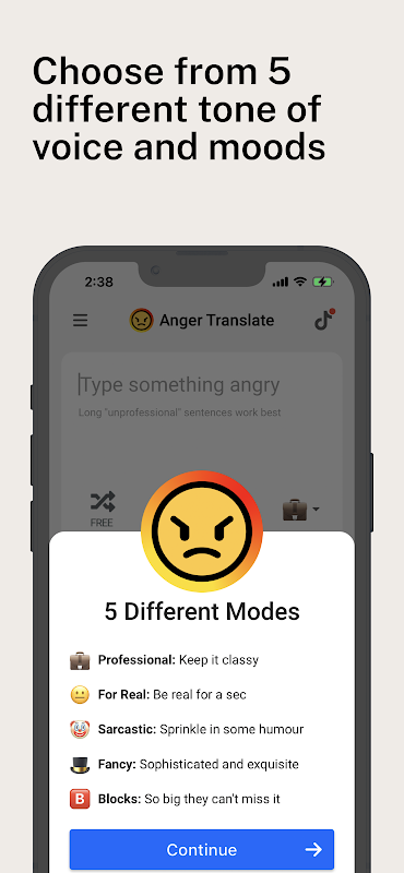 - Text or Voice Translation: Write or speak your frustrations out loud and let Anger Translate speak back a refined response with its text-to-speech functionality. It can yell for you.