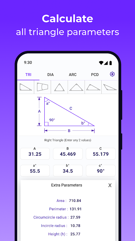 📐 ماشین حساب مثلثاتی همه کاره: با یک برنامه ماشین حساب مثلثاتی که قطر دایره و دایره دایره ای، اندازه گیری قوس و حتی PCD (قطر دایره گام) را برای طیف گسترده ای از اشکال هندسی محاسبه می کند، پتانسیل کامل مثلثات را آزاد کنید.