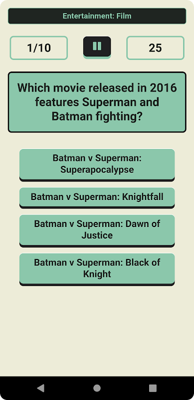 - از بین 24 دسته انتخاب کنید یا یک مسابقه با سؤالات از دسته های تصادفی بازی کنید.