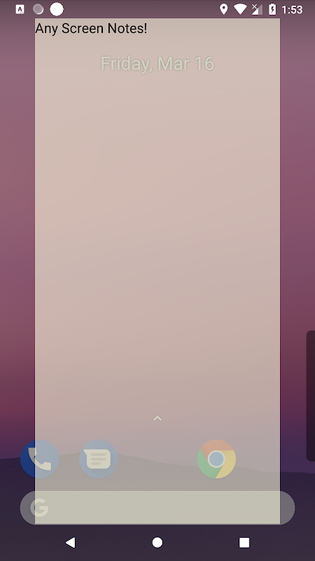 Any Screen Notes makes it easier to make and read notes. Enabling Any Screen Notes will make it possible to take notes from ANY screen. All you will have to do is touch a translucent, floating button. The button will float over every screen, allowing you to access your notes everywhere! Clicking on it will open your notes, and if you want, you will still be able to see what was on your screen before! This overlay is customizable, tailored to your preferences. Taking notes has never been this easy!
