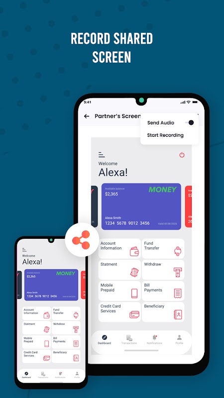 برنامه اشتراکگذاری صفحهنمایش تلفن همراه زنده برای به اشتراک گذاشتن هر گونه مکالمه صوتی زنده با دوستان و اقوام و اشتراکگذاری صفحه نمایش تلفن همراه خود برای پخش زنده روی صفحه تلفن همراه با دوستان.