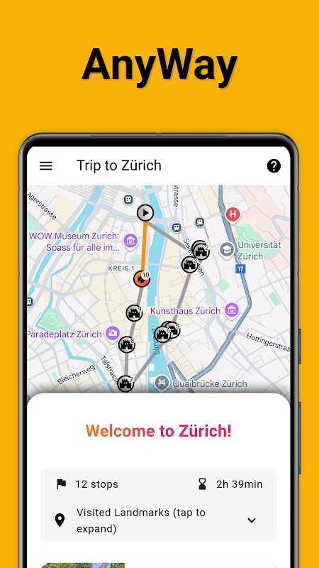AnyWay برنامه ای است که به شما کمک می کند سفرهای شهری واقعا منحصر به فرد را برنامه ریزی کنید. هنگام برنامهریزی یک سفر جدید، میتوانید اولویتها و محدودیتهای را مشخص کنید و به هر حال یک برنامه سفر شخصیسازی شده را فقط برای شما ایجاد کنید.