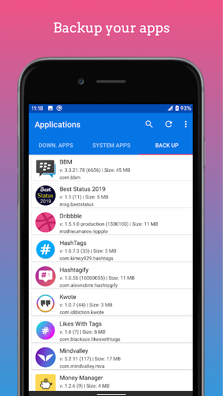 توجه: با توجه به دلایل فنی ما می توانیم فقط پشتیبان گیری از برنامه (APK) اما نه داده های برنامه است. داده های برنامه شما ممکن است از دست داده در صورتی که برنامه نصب شده است.