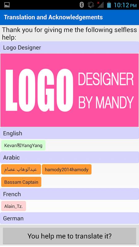 * به ما کمک کنید نرم افزار ما ترجمه، به طوری که ما می توانید زبان های تر (مانند ژاپنی، کره ای، اسپانیایی، پرتغالی، فرانسوی، و غیره) پشتیبانی می کند. در "تنظیمات" - "ترجمه و تشکر و قدردانی" تابع، که از طریق آن شما می توانید به من ترجمه خود را ارائه