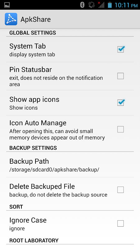 * پشتیبان گیری: پشتیبان بسته نصب و راه اندازی برنامه های نرم افزار. نرم افزار برنامه بسته نصب می شود نسخه پشتیبان تهیه در کارت ذخیره سازی. مکان پیش فرض در / sdcard / apkshare / پشتیبان گیری است. محل پشتیبان را می توان با تنظیم تغییر یافتهاست. اسناد پشتیبان را می توان به دوستان خود را از طریق راه های مختلف و یا دستگاه های دیگر برای نصب و راه اندازی ارسال می شود.
