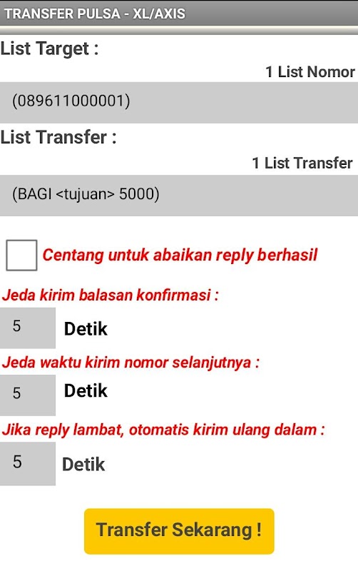 Dengan fitur Jeda Waktu Kirim, Anda bisa mengatur jarak waktu Transfer Pulsa tiap Nomor. Ini untuk menghindari terjadinya Double Transfer.