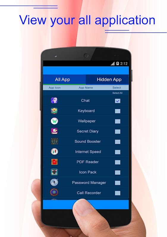 برنامه آیکون وانیویس پرتاب که برنامه های خود را از منوی تلفن پنهان است. آن را به برنامه حذف نمی شود اما آن را در واقع پنهان کردن برنامه شما و هیچ کس دیگر از شما می توانید آن دسترسی داشته باشید. مخفی کردن برنامه های خود را از دوستان فضول و کودکان خود را با دسترسی به امنیت قدرتمند است. شما فقط نیاز به تیک بر روی آیکون برنامه که شما نیاز به مخفی کردن و به آن انجام شده است. زمانی که می خواهید به آن اضافه کنید در منوی تلفن تماس فقط آن را علامت.