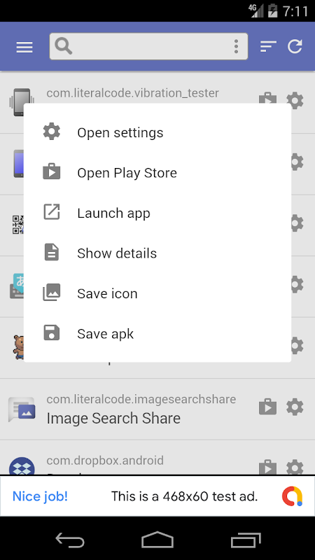 * با ضربه زدن روی یک ردیف از برنامه، منوهای "تنظیمات باز" و "باز کردن با فروشگاه Play" نمایش داده می شود. شما همچنین می توانید تصاویر آیکون و فایل های برنامه (APK) را ذخیره کنید.